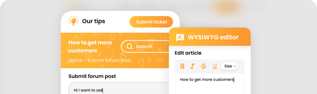 Obohaťte svoje kontaktné centrum o komplexnú znalostnú databázu. Ľahko vytvárajte užitočné články, informačné sekcie a návody typu „urob si sám“ pre zákazníkov, ktorí radšej hľadajú riešenie na vlastnú päsť. Poskytnite odpovede na bežné otázky pomocou často kladených otázok alebo vytvorte fóra, kde sa ľudia môžu spojiť s agentmi alebo inými zákazníkmi a získať podporu.