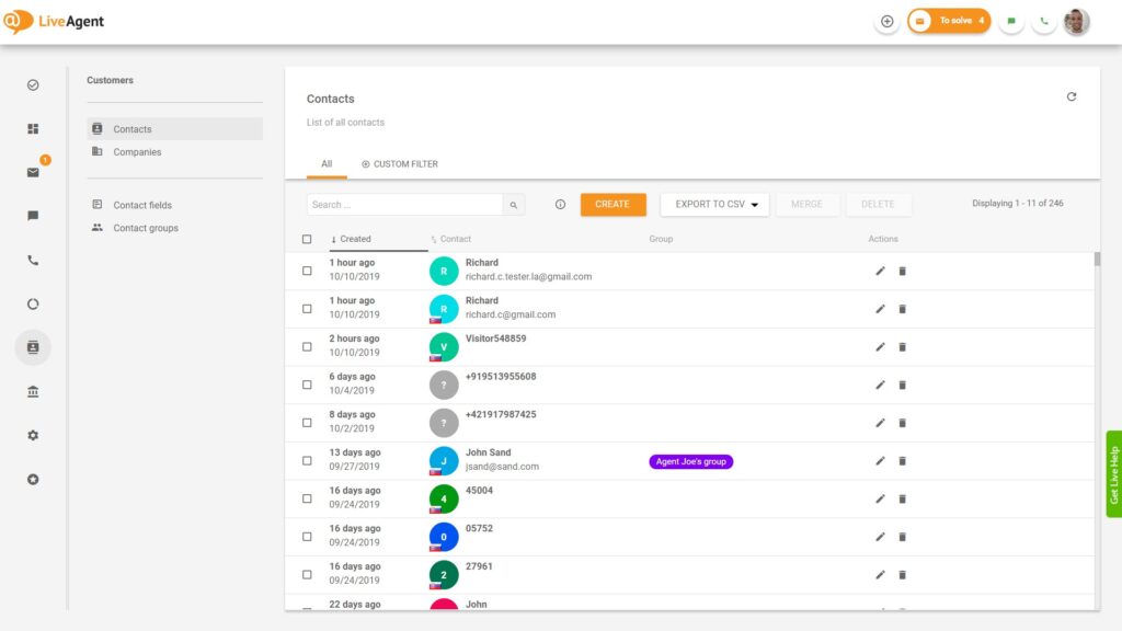Prezerajte si informácie o vašich zákazníkoch, od základných údajov, cež jazykové preferencie, až po údaje z prispôsobiteľných polí kontaktu. Vždy keď vás niekto nový skontaktuje, v softvéri LiveAgent sa vytvorí ďalší kontakt.