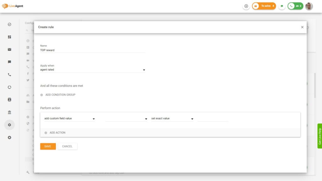- Pravidlá poskytujú tú najširšiu škálu akcií zo všetkých dostupných pravidiel v softvéri LiveAgent.