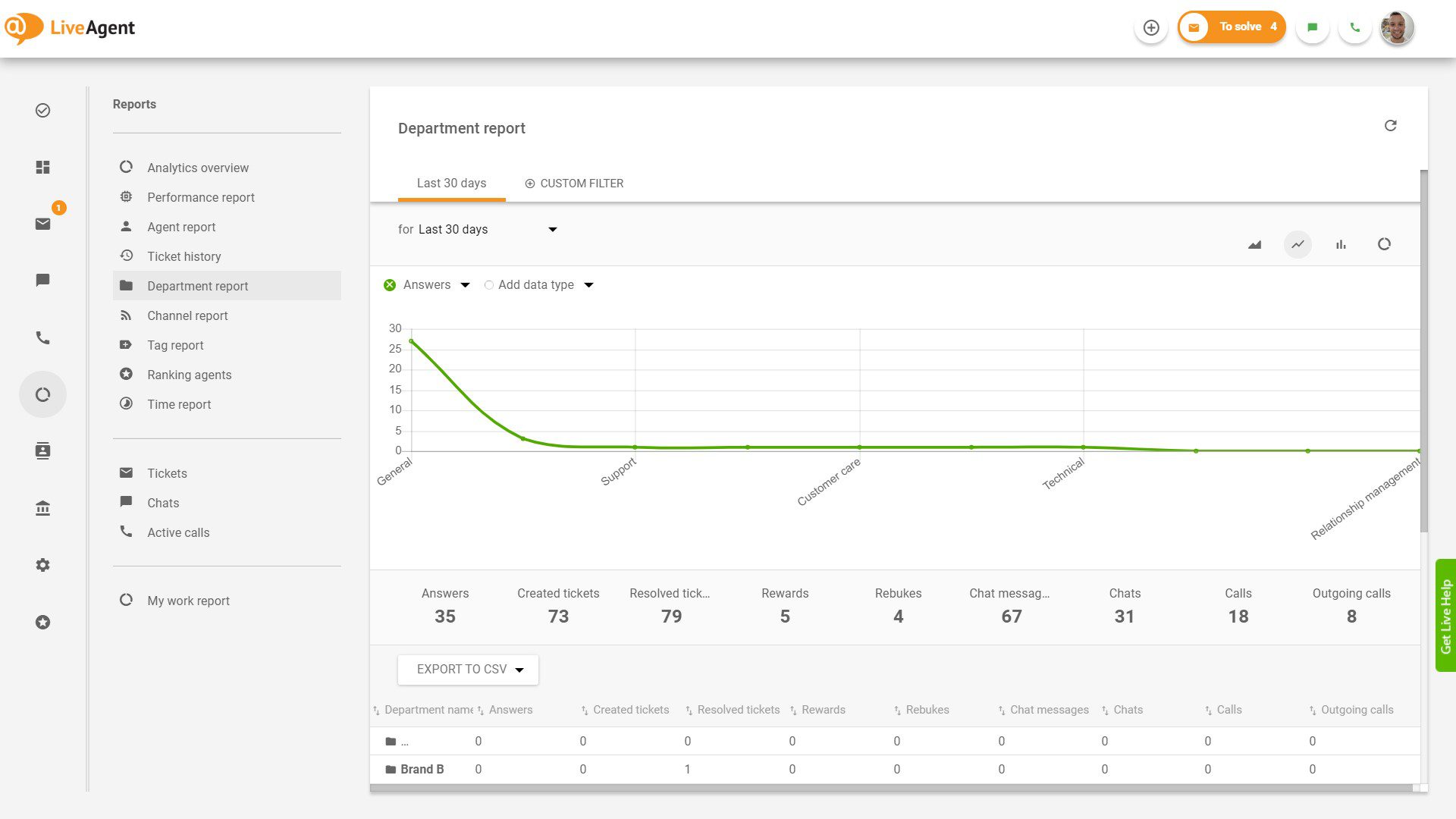 LiveAgent ponúka report vyriešených tiketov, chatov, hovorov, ohodnotení a ďalších ukazovateľov (prezrite si všetky možnosti nižšie) za konkrétne časové obdobie. Jednotlivé vstupy môžu byť zotriedené na základe času, oddelenia, kanálu či agentov. Tento report môže byť vyexportovaný do CSV súboru.